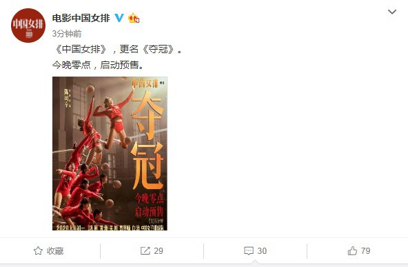 @电影中国女排官方微博宣布,《中国女排》更名《夺冠》,并于昨晚零点启动预售。