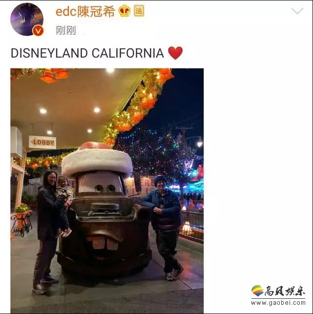 1月17日凌晨,陈冠希晒出了一家三口出游的全家福,并配文:Disneyland California。照片中陈冠希戴着帽子和眼镜,打扮休闲又不失时尚感。秦舒培则穿一件黑色的宽松外套,简单随性。陈冠希两岁的女儿Alaia被妈妈抱在怀里,扎着马尾辫,已经快要达到妈妈身高的一半了。