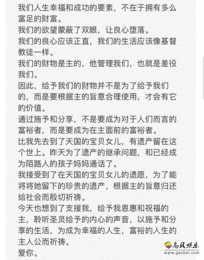 对话截图中,雪莉父亲表示:“去了天堂的女儿留下遗产,昨天因遗产继承问题,与已成陌路人的孩子的母亲通话,发生了争执!希望能依从天主意思,继承在天国快乐的女儿留下的珍贵遗产,以回报社会。 ”雪莉的父亲还在对话中表示:“人生幸福与成功,不在于拥有的财富,我们不应成为人们面前的富有者,而应成为主面前的富有者。”