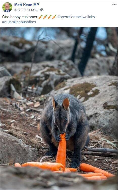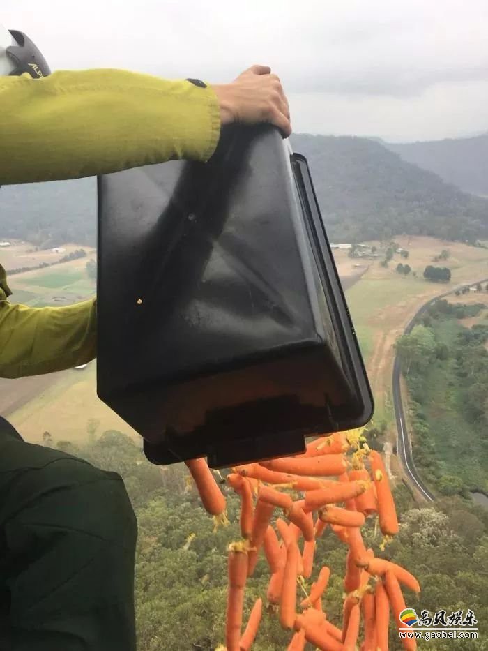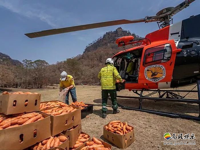 为此澳大利亚新南威尔士州能源与环境部长马特•基恩日前宣布了一项救援行动,在新威尔士州的一些国家公园空投了大约2200千克的胡萝卜、红薯,主要用于投喂当地的岩袋鼠。