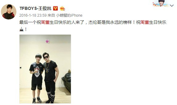 著名华语歌手周杰伦迎来了自己41岁生日,众多粉丝纷纷为周董庆生,作为华语乐坛标志性人物,周董的歌曲影响了大批年轻明星的音乐道路,这其中就包括了TFBOYS的王俊凯。