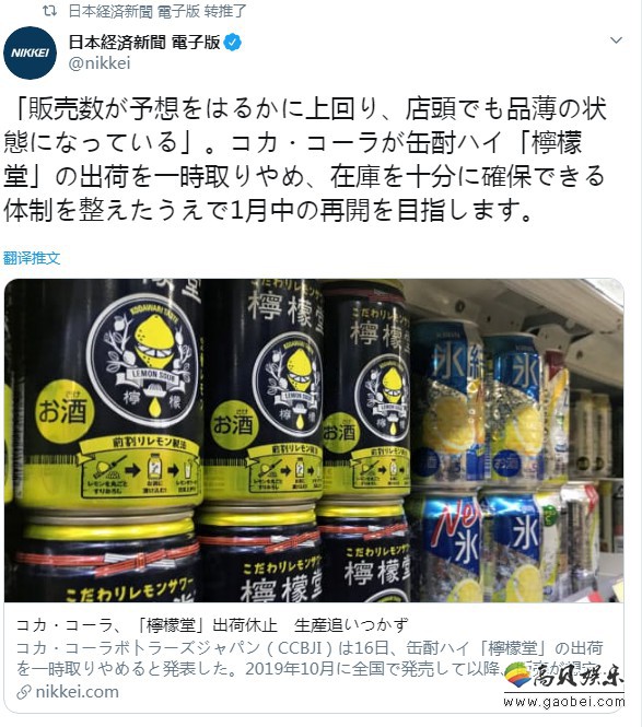 据日本经济新闻报道,日本可口可乐公司宣布暂停其推出的“柠檬堂”汽酒饮料供货。
