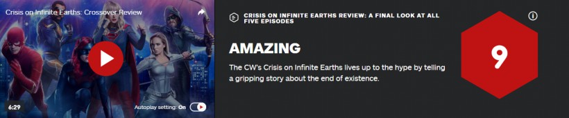IGN为CW台近期的联动大事件“无限地球危机”打出了9分的高分评价。评测者认为,这是CW推出的绿箭宇宙联动企划中最棒的一个。