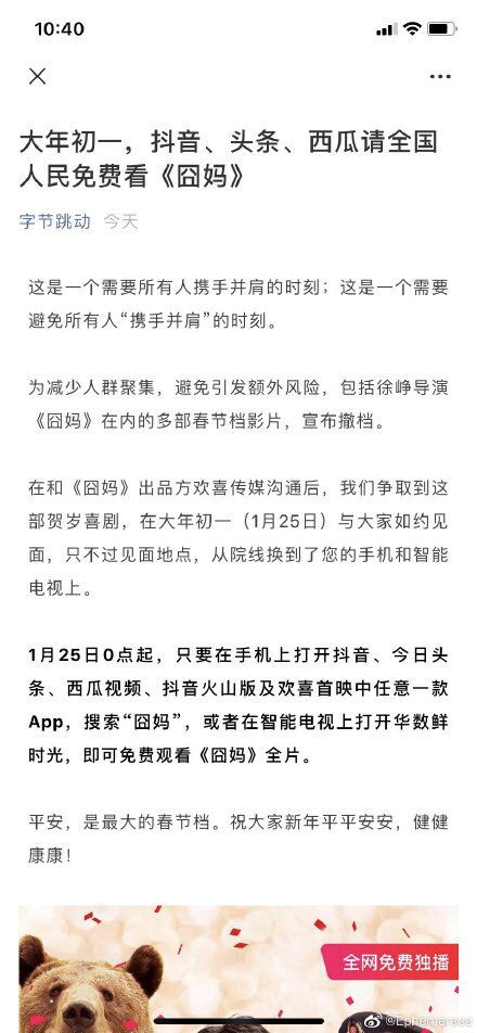 字节跳动消息:“这是一个需要所有人携手并肩的时刻,这是一个需要避免所有人“携手并肩”的时刻”。为减少人群聚集,避免引发额外风险,和《囧妈》出品方欢喜传媒沟通后,我们争取到这部贺岁喜剧,在大年初一(1月25日) 与大家如约见面,只不过见面地点,从院线换到了您的手机和智能电视上。