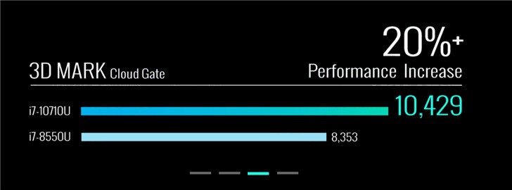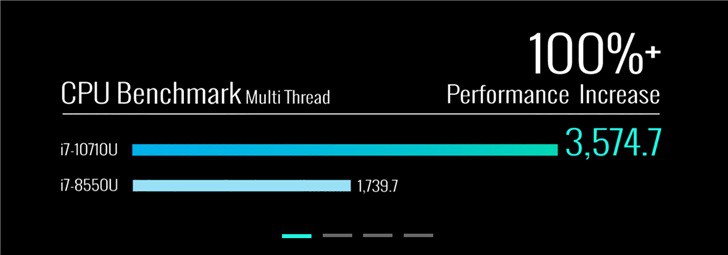 在性能方面,技嘉表示6核的i7-10710相比前代的i7-8550U提升很大,3DMark跑分提升了20%,而CPU 多线程跑分则是提升了一倍。
