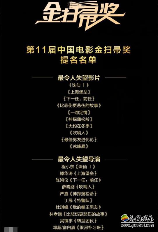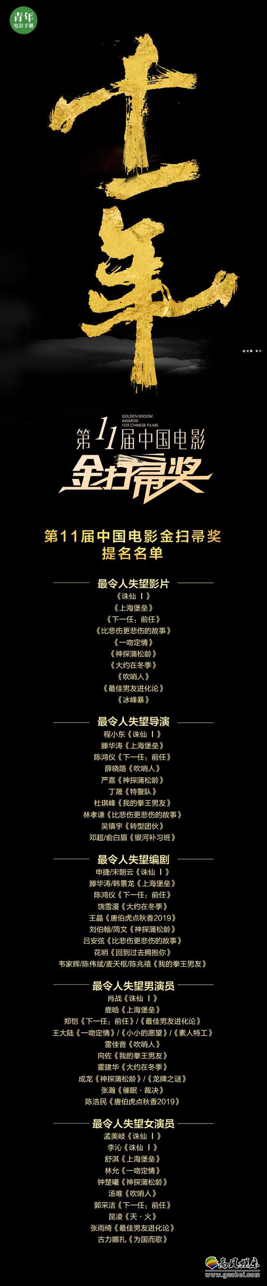 金扫帚奖主办方《青年电影手册》杂志在官方微博公布了第11届金扫帚奖的提名名单。其中《诛仙I》《上海堡垒》《下一任:前任》《比悲伤更悲伤的故事》《一吻定情》《神探蒲松龄》《大约在冬季》《吹哨人》《最佳男友进化论》《冰峰暴》几部影片入围年度最令人失望影片。