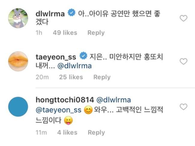 先是IU在影片下留言说:「啊...... 如果能只给IU做演出就好了。 」随后太妍回复她:「知恩...... 对不起,Hongttochi是我的......」最后演奏家本人回复了两位歌手:「哇哦...... 有一种受到告白的感觉耶^^」
