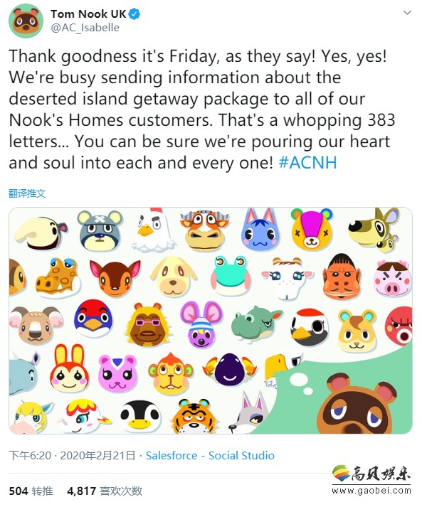 据twinfinite报道,在之前的《动物之森:新地平线》直面会公布了游戏的新情报后,狸猫Tom Nook接管了游戏的推特账户,连名字同头像一起都改成了Tom Nook。《动物之森》官推近日表示,在《动物之森:新地平线》中,确认至少会有383名动物村民。