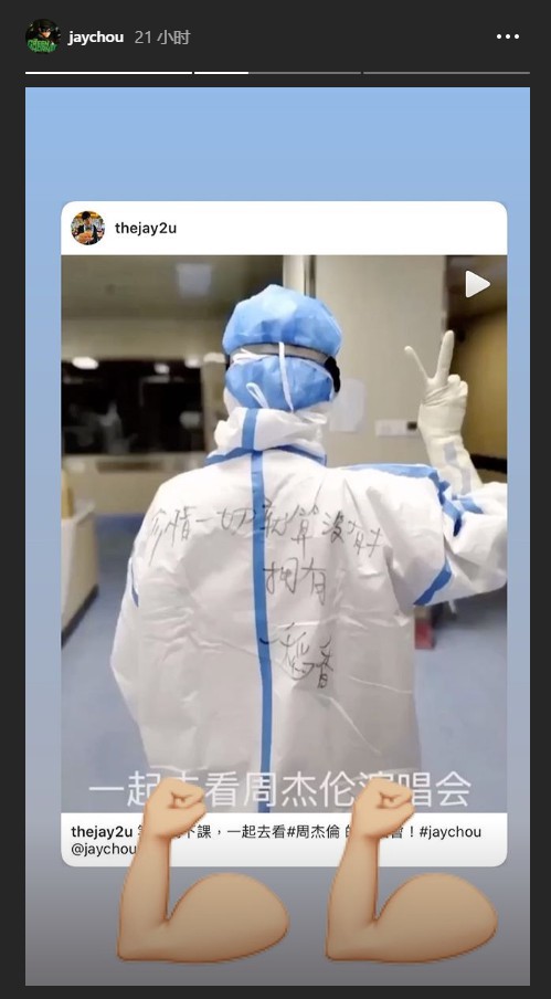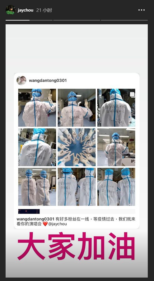 近日,一些网友在社交网络晒出了自己身穿医护工作服的照片,大家在工作服上写着周杰伦《可爱女人》、《听妈妈的话》、《退后》、《稻香》等歌词,并表示:“有好多粉丝在一线,等疫情过去,我们就来看你的演唱会”。