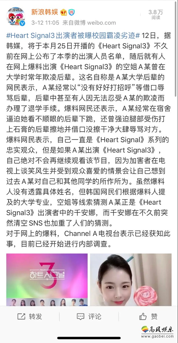 韩国Channel A电视台《Heart Signal3》还没有开播就有出演人员被爆出了过去的校园霸凌劣迹。