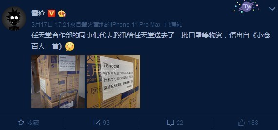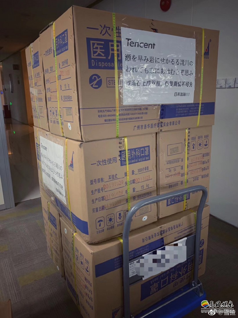 游戏人多边形@雪猹昨日在微博晒出了腾讯的任天堂合作部送给任天堂的一批口罩等物资。