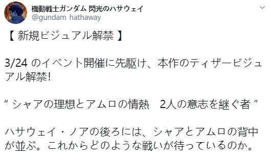 《机动战士高达:闪光的哈萨维》推特今日发布了一则新的视觉图,并宣布在3月24日会公布更多消息。