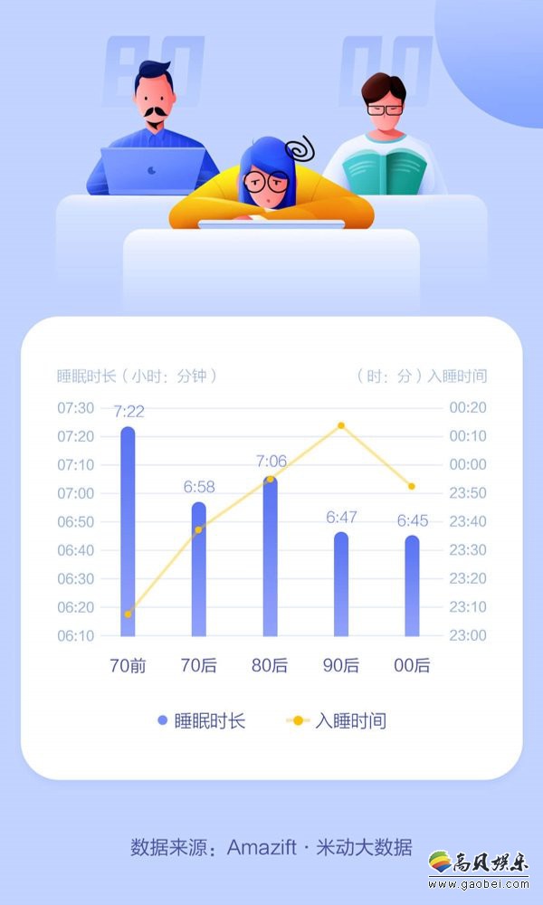 分年龄层来看,年纪越大的人睡的越养生,各年龄段人群睡眠中,只有70前和80后平均每晚的睡眠时间超过了7小时。00后和90后睡眠堪忧,调查发现,43%的90后和27%的00后每天都熬夜。90后人群熬夜最严重,平均在零点之后入眠。