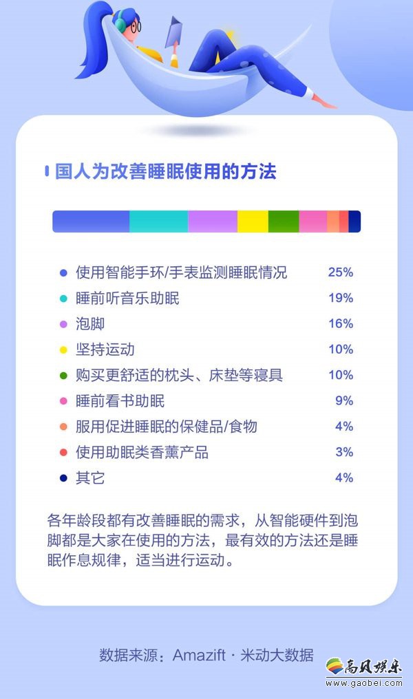 国人为了改善睡眠也做了很多努力,除了佩戴智能手环/手表监测睡眠之外,听音乐、泡脚和坚持运动是大家为了改善睡眠使用最多的方法,其他还有购买更舒适的寝具、看书等方式。