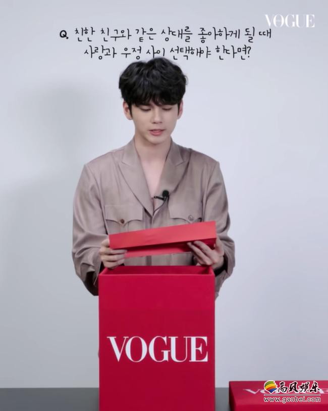 21日,VOGUE KOREA的Youtube频道公开了一段对邕圣佑的采访影片,其中有一个问题是:「和好朋友喜欢上同一个女生的话,会选择友情还是爱情? 」邕圣佑读完纸条上的提问后露出复杂的神色,轻轻感叹了一句「哇哦」。