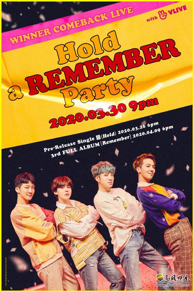 YG Entertainment 今天(23 日)发出 WINNER 的最新预告画报,宣布他们将於 30 日晚间八点(韩国时间)举行直播节目《WINNER COMEBACK LIVE : Hold a “Remember” Party》,巧妙地结合了先行曲 “Hold” 以及新专辑 “Remember” 的名字。