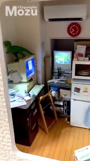 虽然空间足够小,但是这位小哥还是让不少物件都在这个基地中得到还原,比如复古的CRT显示器,超迷你的电冰箱、微波炉等等,整体感觉非常的精致。
