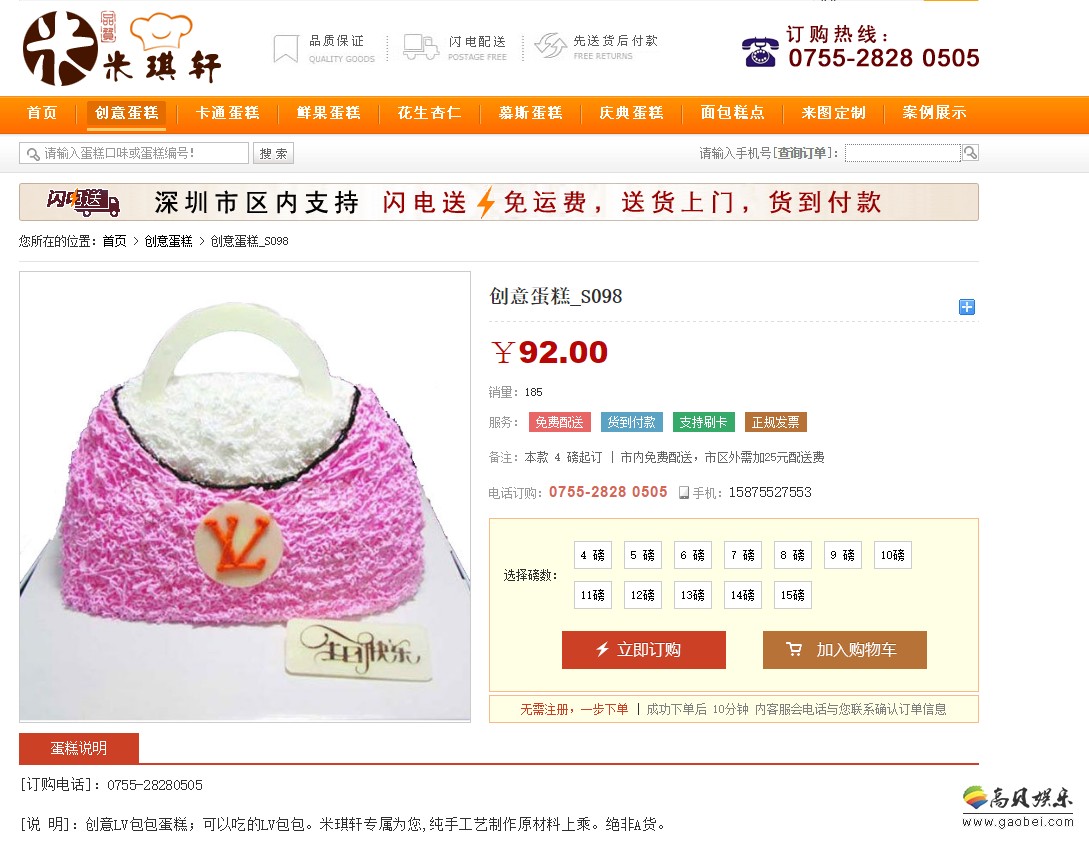 深圳米琪轩创意蛋糕:一次品味,一生回味,我们是一家专注于:创意生日蛋糕,大型活动蛋糕、大型庆典蛋糕、婚庆蛋糕、儿童卡通蛋糕,个性生日蛋糕,专属私人定制蛋糕,婚礼蛋糕,祝寿寿宴蛋糕,公司周年庆典蛋糕,活动宴会蛋糕,公司下午茶西式糕点,来图设计定制蛋糕等。公司位于深圳市南山区西丽镇南山科技园,深圳市区20公里内免费送货上门。目前可配送的范围有南山区。福田区。宝安区。罗湖区。龙华新区。